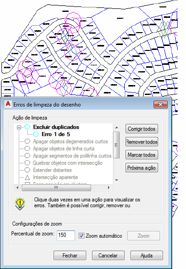 Usando ferramentas de Limpeza de desenho, é possível automatizar a correção de erros comuns de desenho e digitalização. Excluir duplicados, corrige objetos distantes e soltos, e mais.