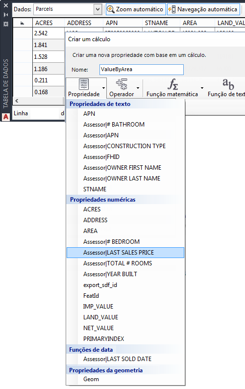 4. Clique em Propriedade. Em Propriedades numéricas, selecione Assessor | último preço de venda.