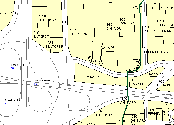 Para recursos lineares, é possível especificar que a legenda para um recurso segue a curva da linha. Por exemplo, rios podem exibir seus nomes ao longo das suas dobras e curvas. Neste exercício, você usa o recurso Colocação avançada para legendar os riachos no mapa.