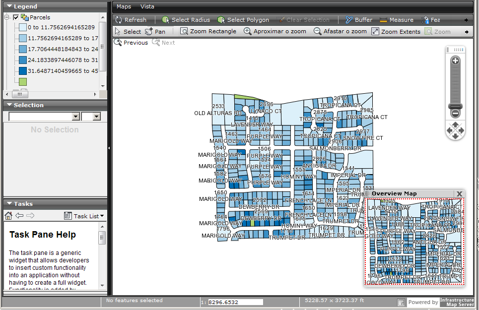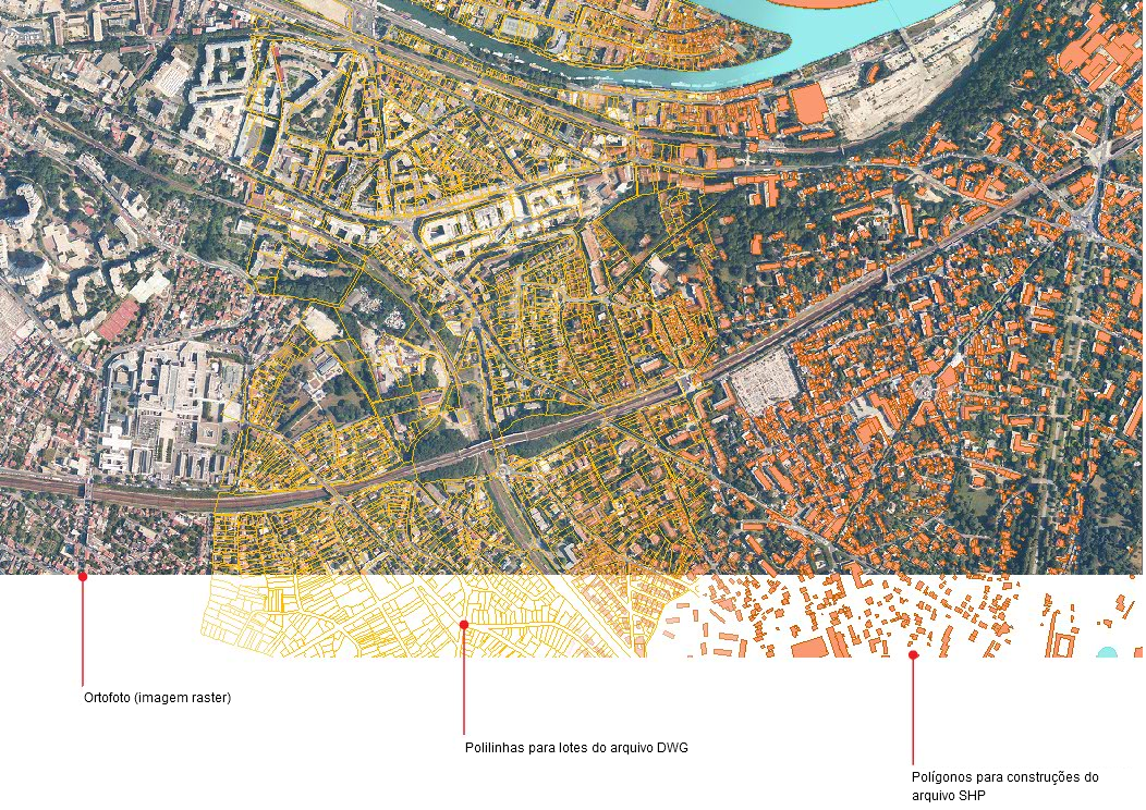 Este mapa contém uma foto de imagem raster, dados de construção armazenados em um arquivo SHP e dados de lote armazenados em um arquivo DWG.