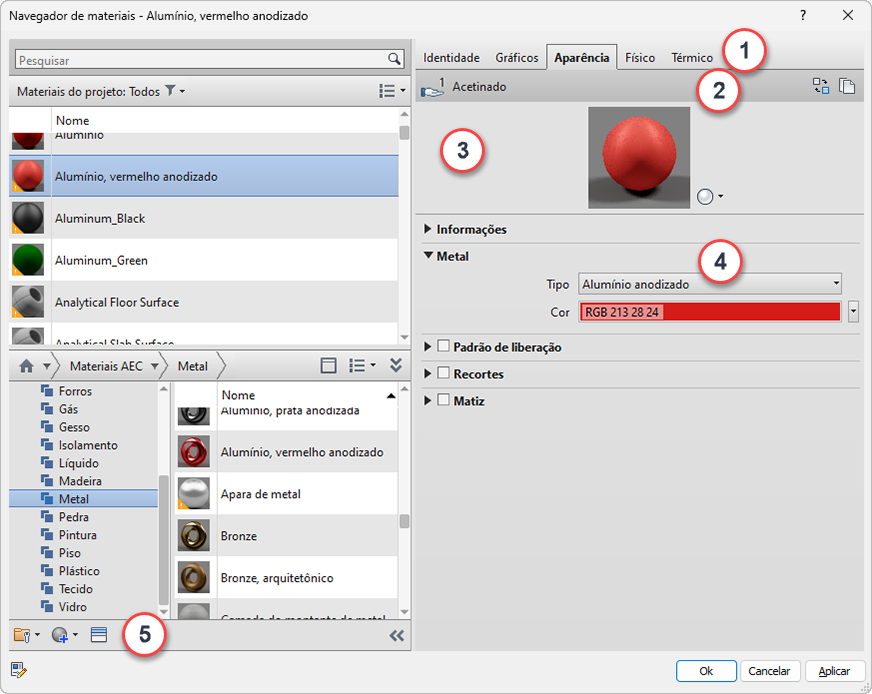 | 4 | Painel Propriedades: visualizar e gerenciar propriedades detalhadas do recurso selecionado. O nome e descrição do recurso são exibidos abaixo do painel suspenso Informações. O exemplo acima mostra as propriedades do Metal sendo exibidas (expandidas) para o recurso Aparência “Anodizado – Vermelho”. O conjunto de propriedades que são exibidas por um líquido, por exemplo, é diferente do conjunto de propriedades exibidas para o metal. |