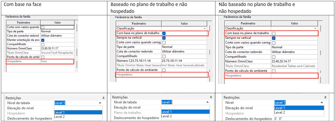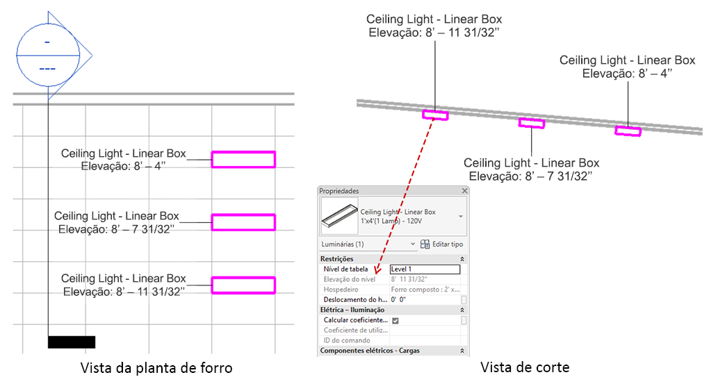 O parâmetro Elevação do nível não é editável quando o elemento é colocado em uma superfície não vertical, como quando um receptáculo é colocado em um piso ou uma luminária é colocada em um forro.
