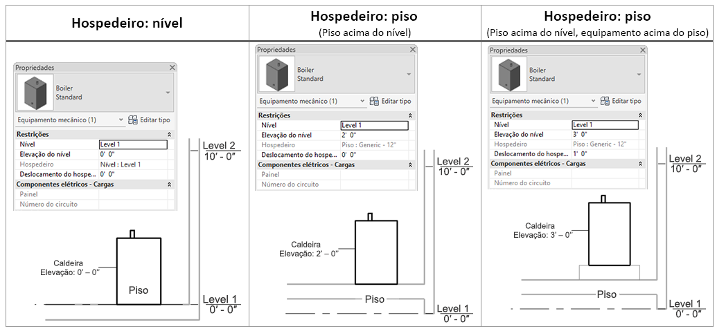 No exemplo abaixo, o piso está 2' 0" acima do nível. Quando a caldeira é colocada no piso, a Elevação do nível = 2' 0" e o Deslocamento do hospedeiro = 0' 0".