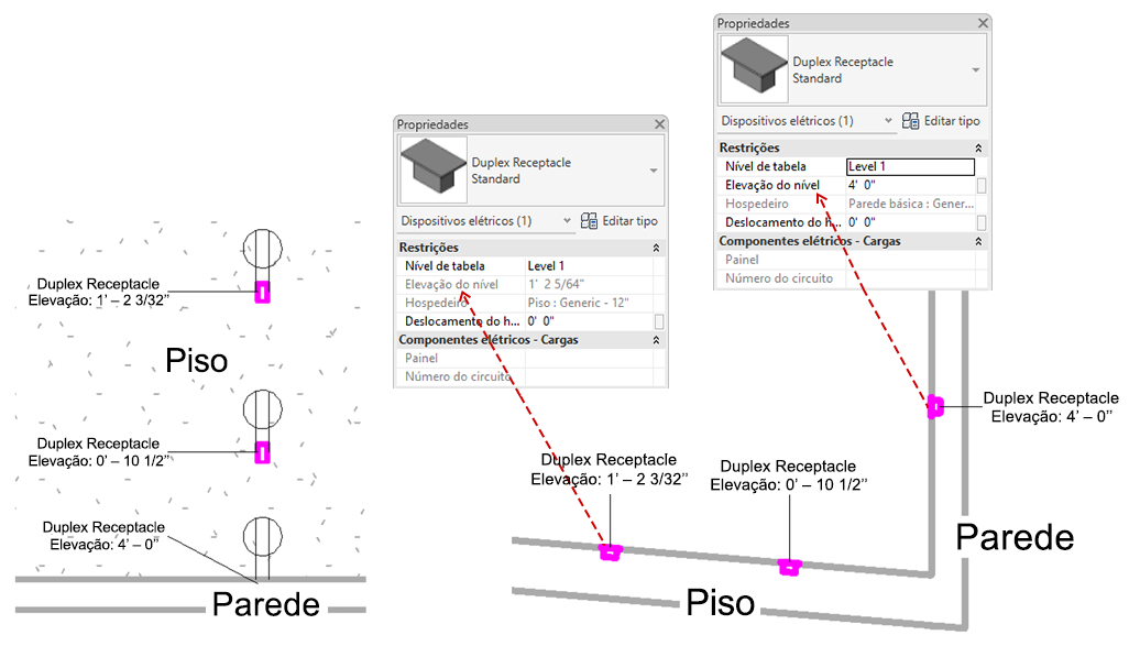 Para os elementos com base na face, o parâmetro Elevação do nível é editável quando o elemento é colocado em uma superfície vertical, como quando um receptáculo é colocado em uma parede.