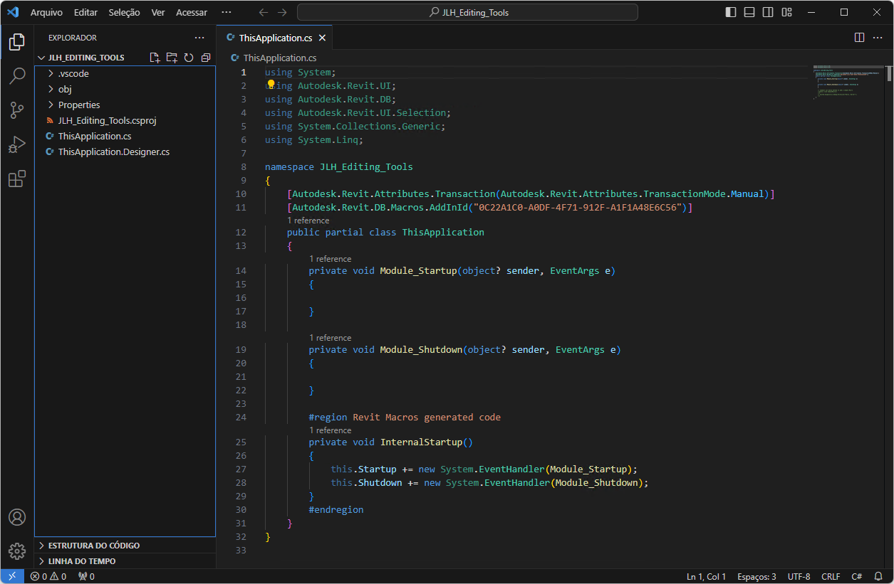 É iniciada uma sessão do Visual Studio Code para escrever as macros. Exibe um modelo inicial para as macros em C#.