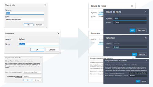 As caixas de diálogo do Revit usadas com frequência foram atualizadas para se alinharem com uma experiência coesa em todos os produtos da Autodesk, incluindo suporte para os temas Claro e Escuro.