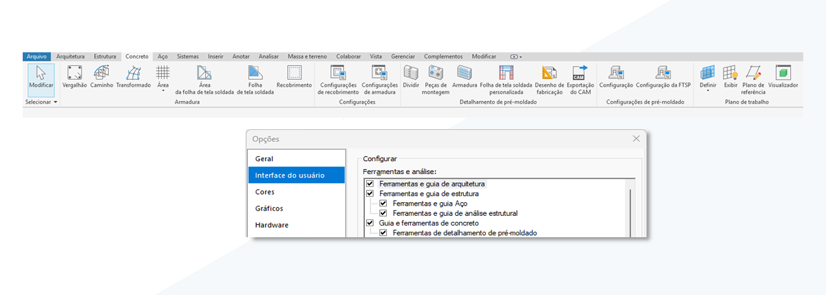 A guia Detalhamento de concreto na faixa de opções centraliza as ferramentas de armadura para fluxos de trabalho pré-moldados e moldados no local, mantendo o acesso contextual aos comandos de armadura e oferecendo maior controle sobre a visibilidade da guia da faixa de opções.