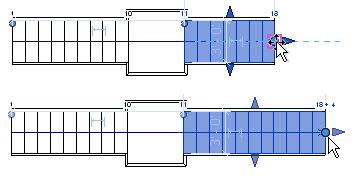 - Adicionar ou remover as etapas em uma extremidade aberta de um lance de escada (arrastar o controle de ponto preenchido da extremidade) não irá alterar os componentes conectados. Neste exemplo, quatro etapas são adicionadas ao segundo lance de escada.