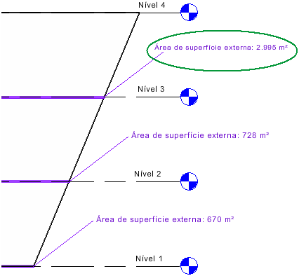 Por exemplo, suponha que uma massa que começa no nível 1 e termina no nível 4 tenha sido criada. Na caixa de diálogo Pisos de massa, selecione os níveis 1, 2, 3 e 4. Como resultado, o Revit cria pisos de massa nos níveis 1, 2 e 3. O software não cria piso de massa no nível 4, porque ele coincide com o topo da massa. Ele não possui uma área de superfície externa (superfícies verticais se estendendo acima de seu perímetro) ou volume (a partir do nível 4). Em vez disso, a área de superfície externa para o nível 3 inclui as superfícies verticais (paredes) que circundam o nível 3 e também a superfície horizontal superior (telhado), que ocorre no nível 4. Como resultado, a área de superfície externa para o piso superior de uma massa pode ser desproporcionalmente mais largo que pisos inferiores.