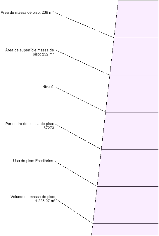 Após criar pisos de massa, é possível identificá-los em vistas 2D. Os identificadores podem incluir informações sobre a área, área da superfície externa, perímetro, volume e uso para cada piso de massa.