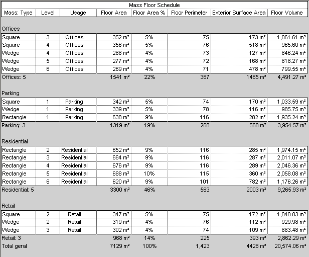 Após criar pisos de massa, crie uma tabela de pisos de massa para atribuir os usos ou para analisar o projeto.
