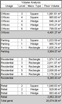 A tabela mostra o volume para cada piso de massa, subtotais de volume por uso, e um total geral para os volumes combinados dos pisos de massa. Use estas informações para estimar as cargas AVAC para o projeto, com base no uso planejado de cada piso de massa.