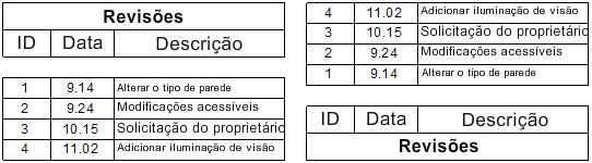As tabelas de revisão podem exibir informações de diversas formas. Algumas empresas de projetos usam a abordagem de cima para baixo, com cabeçalhos de coluna e linhas de revisão iniciando no topo da tabela. Algumas empresas de projetos usam a abordagem de baixo para cima, com cabeçalhos de coluna e linhas de revisão iniciando na parte inferior da tabela. Seja qual for o caso, a tabela de revisão classifica as linhas usando as configurações especificadas na guia Classificar/Agrupar da caixa de diálogo Propriedades da revisão.