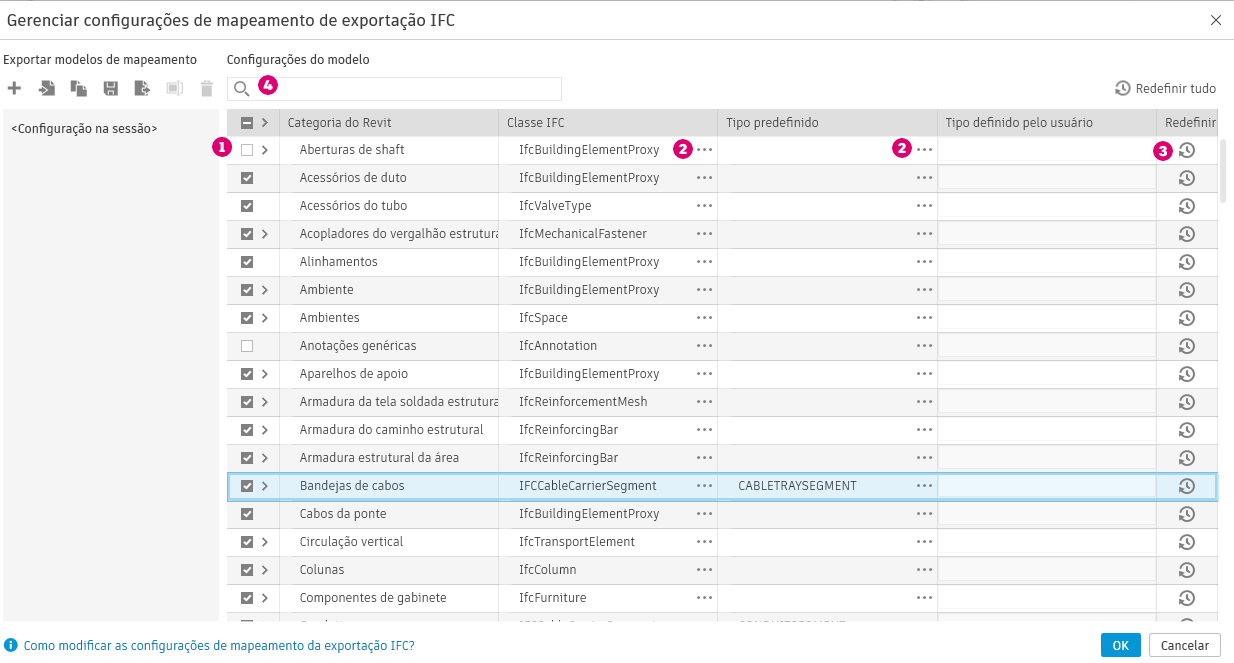Faça alterações na classe IFC e nos tipos predefinidos mapeados para cada categoria do Revit ao exportar um arquivo IFC.