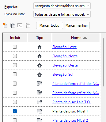 Ao exportar um modelo para diversos formatos, utilize as ferramentas na caixa de diálogo Exportar para selecionar as vistas e folhas que desejar incluir. Salve o conjunto selecionado para posterior reutilização.