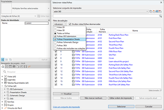 - A caixa de diálogo Exportar/Imprimir inclui cada coleção de folhas como uma alternância de filtro de exibição dedicada, para oferecer suporte à seleção precisa de folhas em uma ou mais coleções.