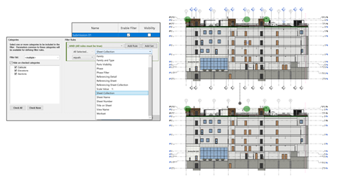 - É possível usar os parâmetros Coleção de folhas e Coleção de folhas de referência em categorias de filtro de vista compatíveis (Elevações, Cortes, Chamadas de detalhe, Referências de vista) e tabelas (Lista de folhas e Lista de vistas).