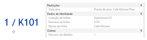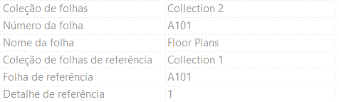 Os parâmetros Coleção de folhas e Coleção de folhas de referência estão disponíveis nas categorias de famílias aplicáveis (Títulos da vista, Referências da vista, Extremidades da chamada de detalhe, Marcas de elevação, Marcas de corte, Blocos de margens e carimbo) para que possam ser usados em legendas.
