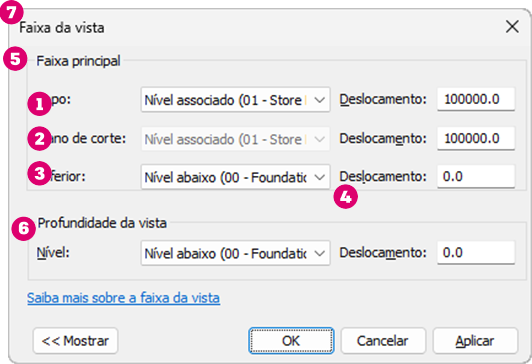 A Profundidade da vista é o plano fora da faixa principal. Altere a profundidade da vista para mostrar elementos abaixo do plano de recorte inferior. Por padrão, a profundidade da vista coincide com o plano de recorte inferior.