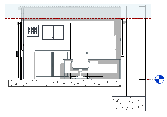 Por exemplo, na elevação a seguir, o azul realçado indica os elementos que ocorrem abaixo do plano de recorte inferior e dentro da profundidade da vista.