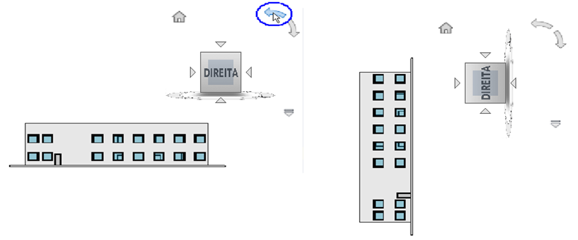Quando você visualizar um modelo de uma das vistas de face, são exibidos dois botões de seta de rolagem ao lado do ViewCube. Utilize as setas de rolagem para rotacionar a vista atual em 90 graus no sentido horário ou no sentido anti-horário em torno do centro da vista.