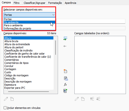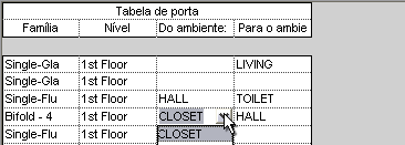 A tabela de portas é aberta. Como os campos Para o ambiente e Do ambiente não refletem automaticamente as alterações feitas na abertura da porta após a mesma ser colocada, é possível editar estes campos ao selecionar um valor na lista.