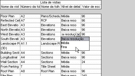 É possível usar uma lista de vistas para visualizar e modificar parâmetros para múltiplas vistas de uma só vez. Por exemplo, suponha que os parâmetros Nível de detalhamento e Escala tenham sido incluídos em uma lista de vistas. Na lista de vistas, é possível alterar os níveis de detalhes de vistas selecionadas de Baixa resolução, Resolução Média ou Alta resolução, ou alterar as escalas da vista para usar configurações consistentes. Também é possível alterar o nome da vista ou o título da vista exibido nas folhas. Usando uma lista de vistas desta forma, é possível identificar e corrigir as inconsistências na configurações da vista a partir de um só local.