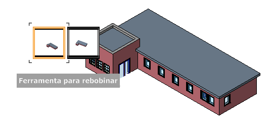 A ferramenta Rebobinar está disponível em todos os SteeringWheels. Quando você utiliza as ferramentas de navegação para reorientar a vista de um modelo, a vista anterior é salva no histórico de navegação. O histórico de navegação armazena uma representação das vistas anteriores do modelo junto com uma miniatura. Um histórico separado de navegação é mantido para cada janela, mas não é mantido após a janela ser fechada. Rebobinar o histórico de navegação é específico da vista.