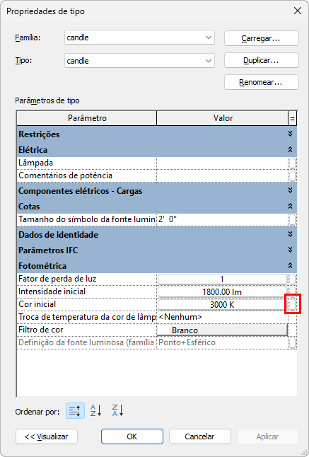 - Na caixa de diálogo Associar parâmetros de família, selecione Intensidade inicial (ou no parâmetro que corresponde ao parâmetro de tipo selecionado) e clique em OK.