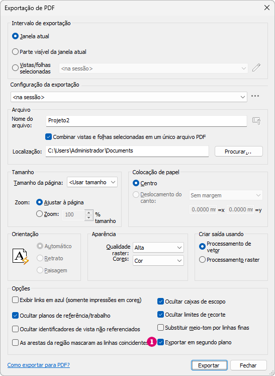 . Exportar em segundo plano está desativado por padrão.