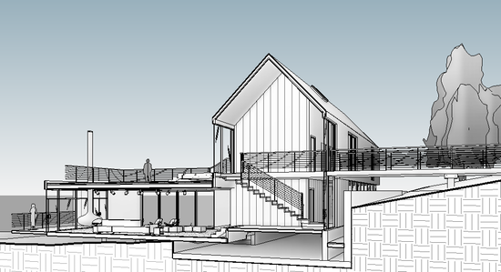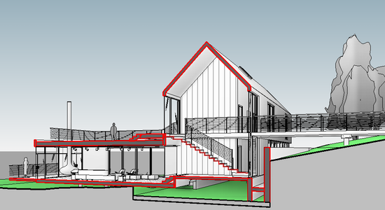 O exemplo abaixo mostra uma vista em perspectiva de corte antes e depois da aplicação de sobreposições gráficas a elementos individuais. Uma linha com espessura de cor vermelha é aplicada às arestas de corte de alguns elementos para realçar a qualidade de corte do modelo. O padrão de superfície e o padrão de corte da topografia foram sobrepostos para separá-los visualmente do modelo de construção.