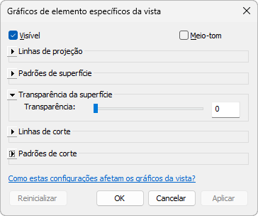 - Transparência da superfície: exiba somente as linhas do elemento e não as superfícies. Use o deslizador Transparência para definir o percentual de transparência da superfície.