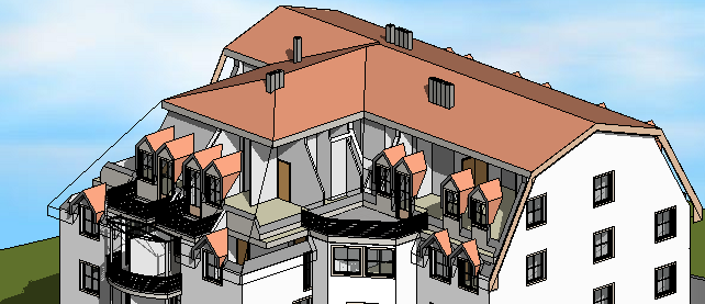 As imagens a seguir mostram o mesmo modelo em vista 3D. A segunda imagem mostra como parte do telhado aparece quando a transparência é aplicada.