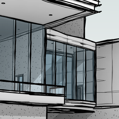 Visualize os resultados quando linhas de esboço são aplicadas à uma vista em perspectiva, uma vista de elevação e uma vista de planta.