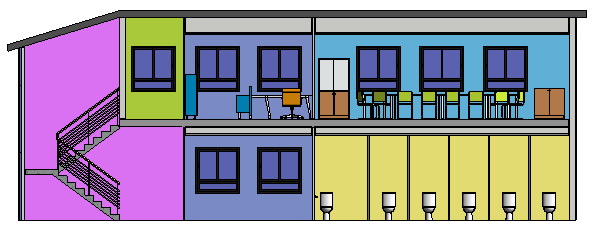 Além de usar um esquema de cores para uma vista da planta de piso, também é possível usar um esquema de cores para colorir e aplicar padrões de preenchimento para ambientes ou áreas em uma vista de corte.