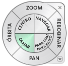 | olhar em volta e navegar por um modelo com a ferramenta Olhar | exiba o círculo grande de navegação completa. Mantenha pressionado a seção Olhar. Arraste para mudar a direção na qual você está olhando. Mantendo pressionado o botão em seu dispositivo apontador, pressione as teclas de seta para navegar no modelo. Solte o botão do mouse para retornar ao círculo. Clique em OK para sair do círculo. |