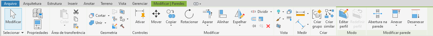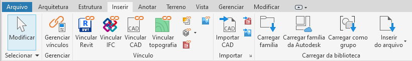 A faixa de opções é exibida quando um arquivo é criado ou aberto. Ela fornece todas as ferramentas necessárias para criar um projeto ou família.