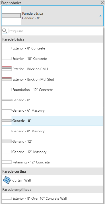 O Seletor de tipos identifica o tipo de família selecionado no momento e fornece uma lista suspensa na qual é possível selecionar outro tipo.