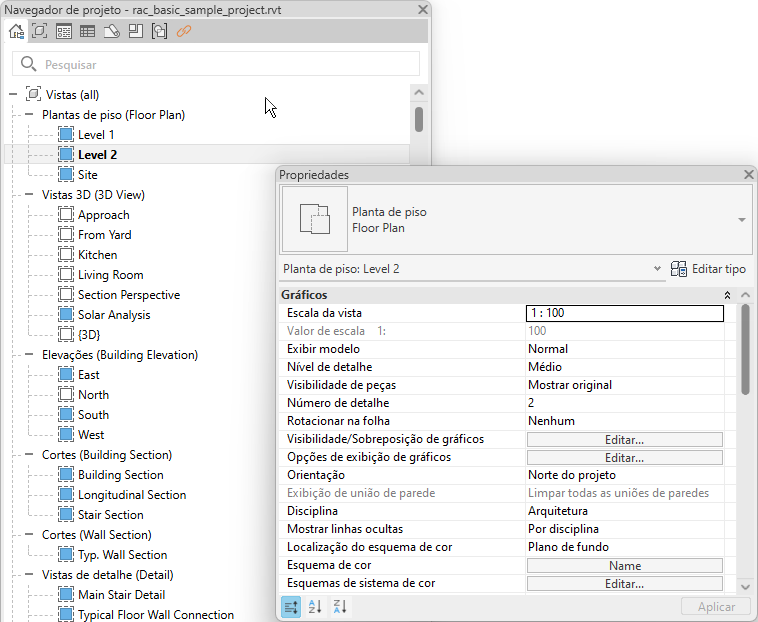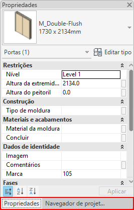Na imagem a seguir, o Navegador de projeto e a paleta Propriedades estão agrupados. Observe que a paleta Propriedades é a guia ativa.