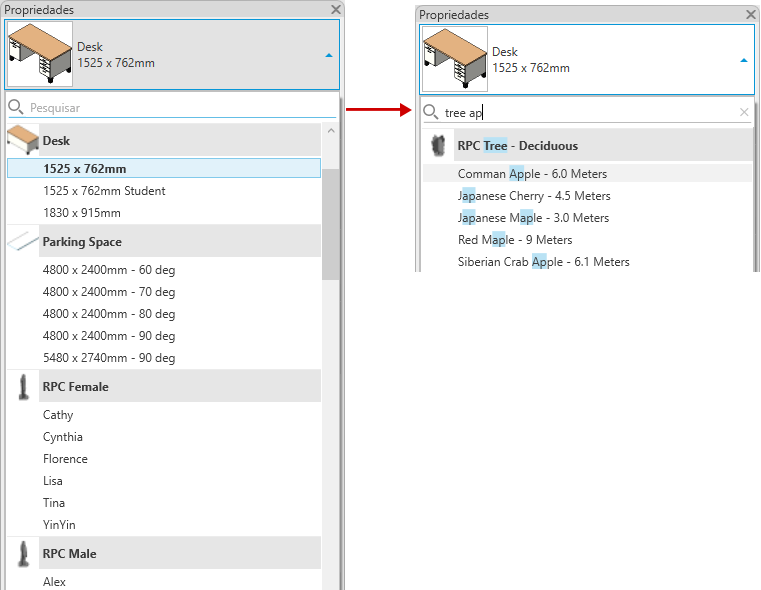 - Paleta Propriedades (lista suspensa para valores de propriedade de instância)