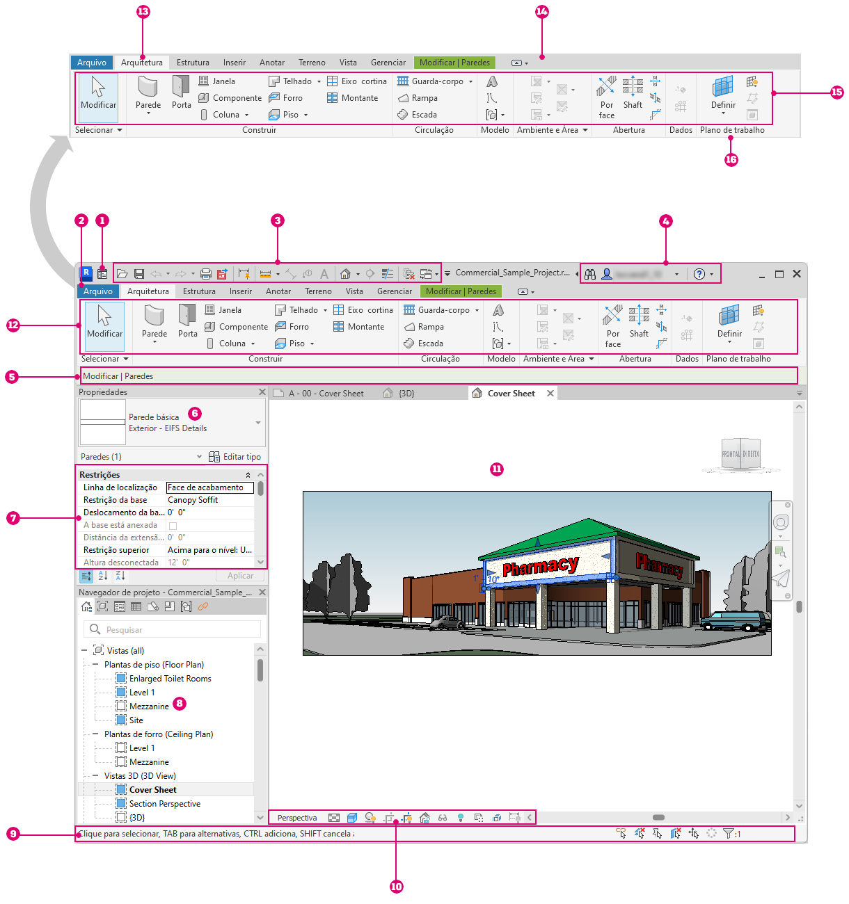 | 14 | Uma guia contextual na faixa de opções, que fornece ferramentas relevantes para o objeto selecionado ou a ação atual |