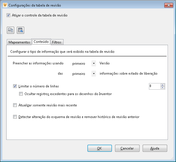 Ao trabalhar com revisões, é possível ter múltiplas versões de um desenho dentro de uma revisão. É possível determinar se deseja que os dados da primeira versão da revisão ou da última versão da revisão sejam exibidos na tabela de revisão na guia Conteúdo.