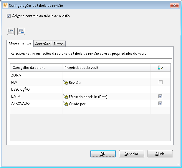 Propriedades do Vault | O nome da propriedade do Vault que foi mapeada para a tabela de revisão associada. O valor para essa propriedade será automaticamente exibido no campo de coluna na tabela de revisão para o desenho. |