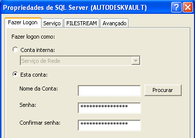 Clique duas vezes no serviço SQL Server (Autodeskvault) e selecione a guia Efetuar login.