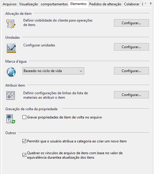 A guia Itens na caixa de diálogo Configurações do Vault contém opções para configurar unidades de medida, gerenciar as preferências de marca d’água, ajustar as configurações para as linhas da lista de materiais e permitir que os itens para gravar de volta as propriedades nos arquivos associados. Também é possível desativar a operação.