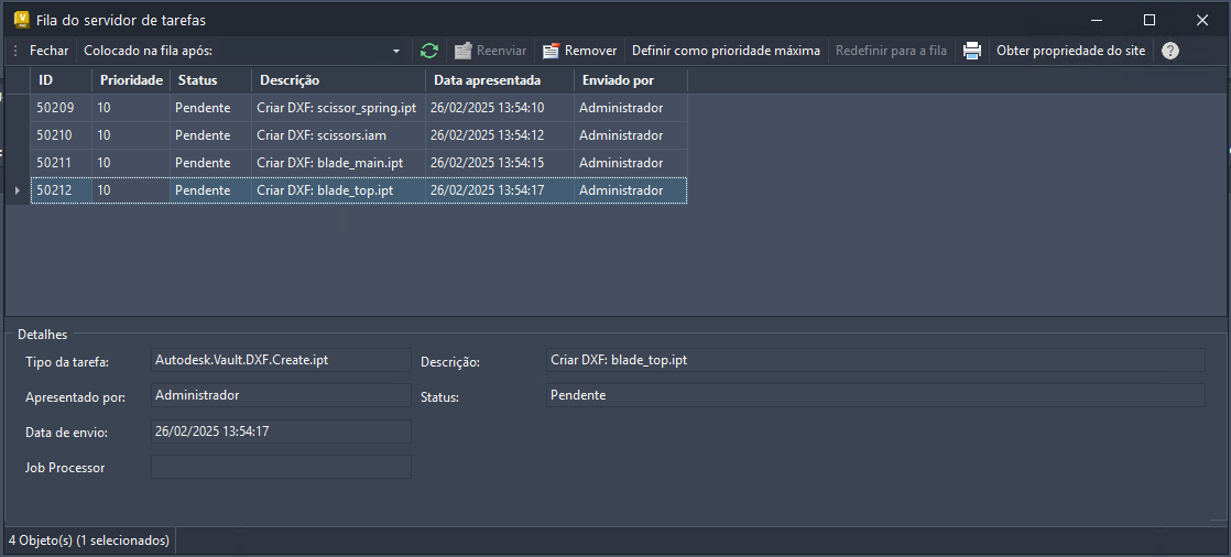 A fila do Servidor de trabalhos é uma lista ou fila de trabalhos enviados por clientes (Inventor, Auto, Vault e Autoloader) que aguardam processamento. Essa fila é armazenada e gerenciada pelo Vault Server.