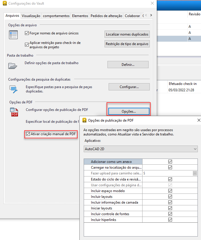 Marque a caixa Ativar criação manual de PDF para criar um PDF sem passar pela alteração de estado de ciclo de vida para um arquivo de desenho. O comando Criar PDF está disponível na barra de ferramentas, no menu de contexto e no menu Ações.