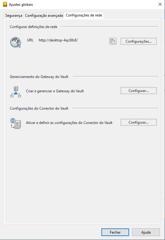 A guia Configurações de rede exibe um URL do servidor usado para conexão com o cliente do Vault.