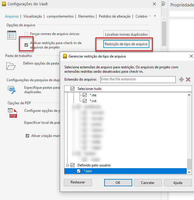 Como administrador, você pode definir a lista de arquivos de projeto em que não pode ser feito check-in quando a opção "Aplicar restrição para check-in de arquivos de projeto" está ativada. É possível adicionar as extensões de arquivo à lista definida pelo usuário, mas não remover as extensões padrão do sistema.