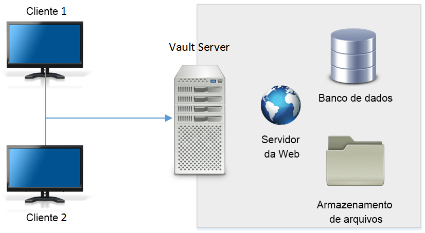 O servidor do Vault armazena e gerencia os arquivos e metadados que compõem o Vault. Esses dados são gerenciados pelo Microsoft SQL Server, um banco de dados relacional da Microsoft. O software do servidor pode ser instalado em um servidor ou em uma estação de trabalho compartilhada por todos os usuários. Para um único usuário, o servidor pode ser instalado com o cliente em uma única e isolada estação de trabalho.